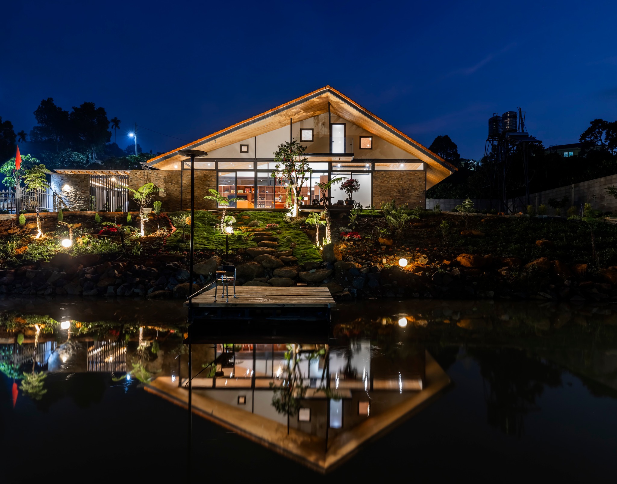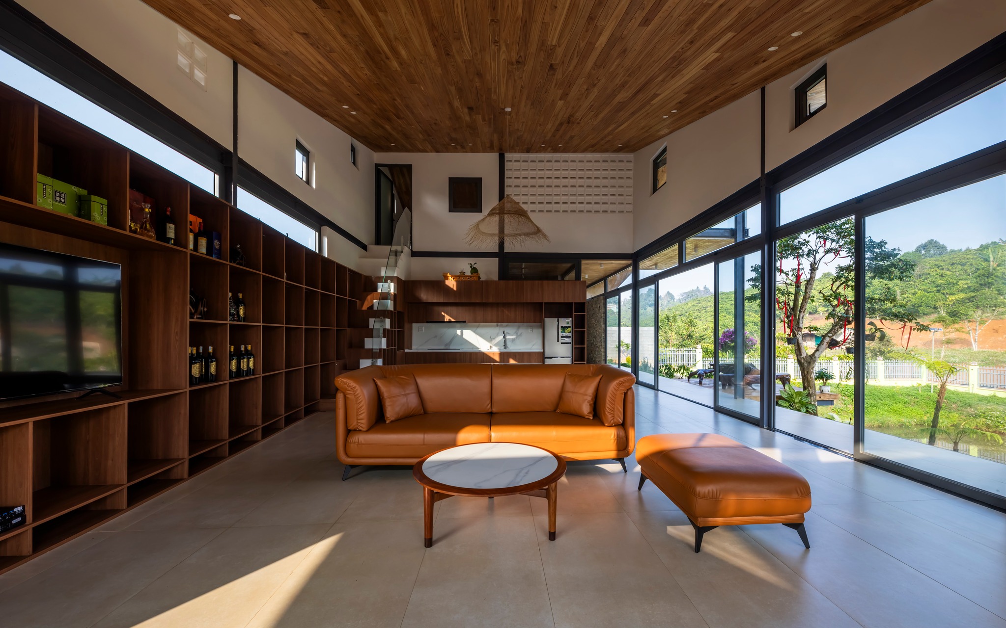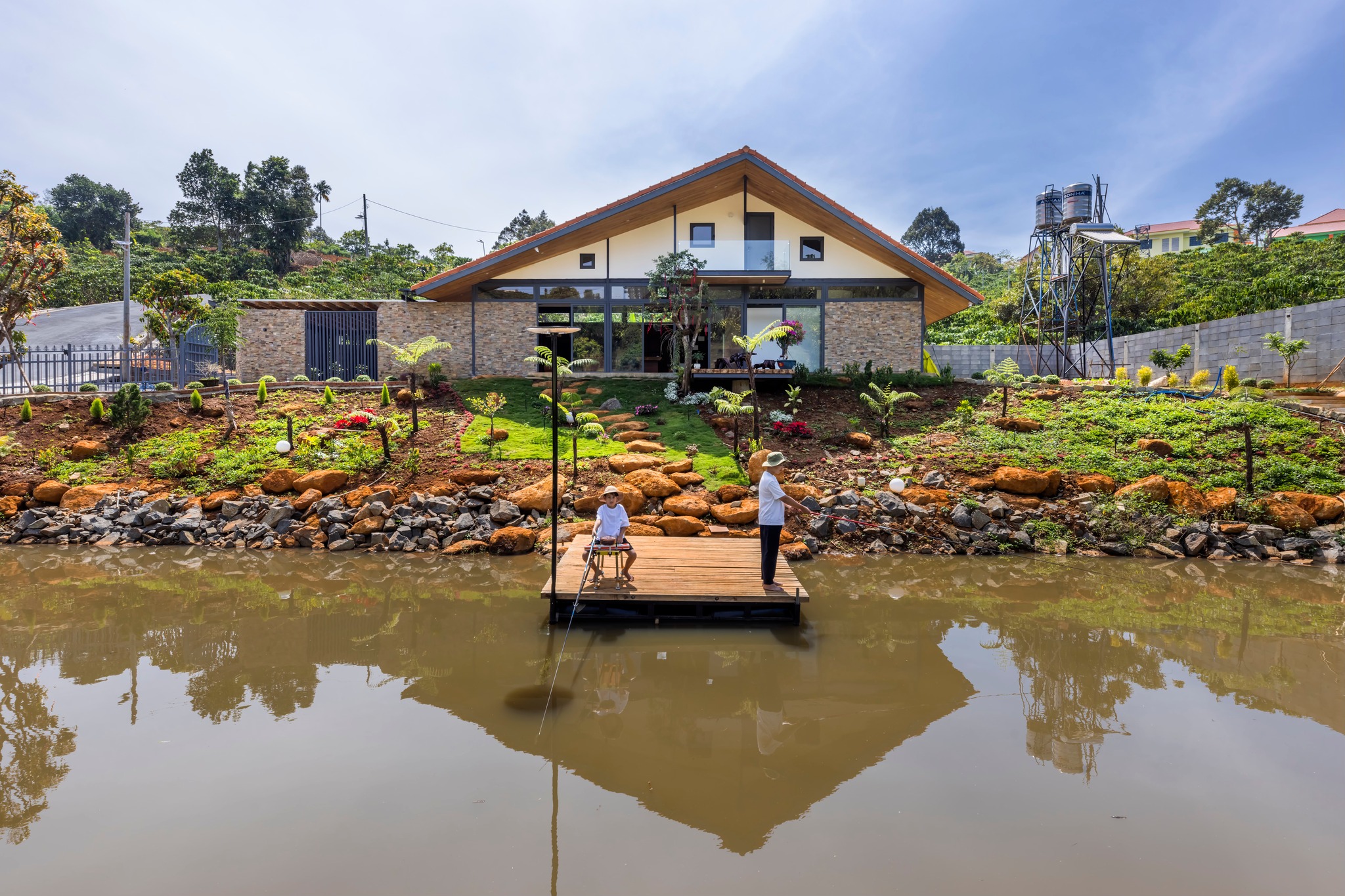 Bám theo những hình ảnh đó, Ngôi nhà với công năng đơn giản cho một gia đình nhỏ bao gồm : nơi để nghỉ ngơi, nấu ăn, tiếp khách, học tập và làm việc đã được gói gọn lại, phần lớn khu đất được dành để trồng cây, trồng rau quanh nhà và trồng hoa quanh một cái hồ lớn phục vụ sở thích nuôi cá. Ngôi nhà với một hệ mái ngói tựa như một ngọn đồi nhỏ không chen lấn mà hoà vào những ngọn đồi xung quanh, hệ trần và sàn được làm bằng gỗ tự nhiên mang lại cảm giác ấm cúng, thân thuộc.