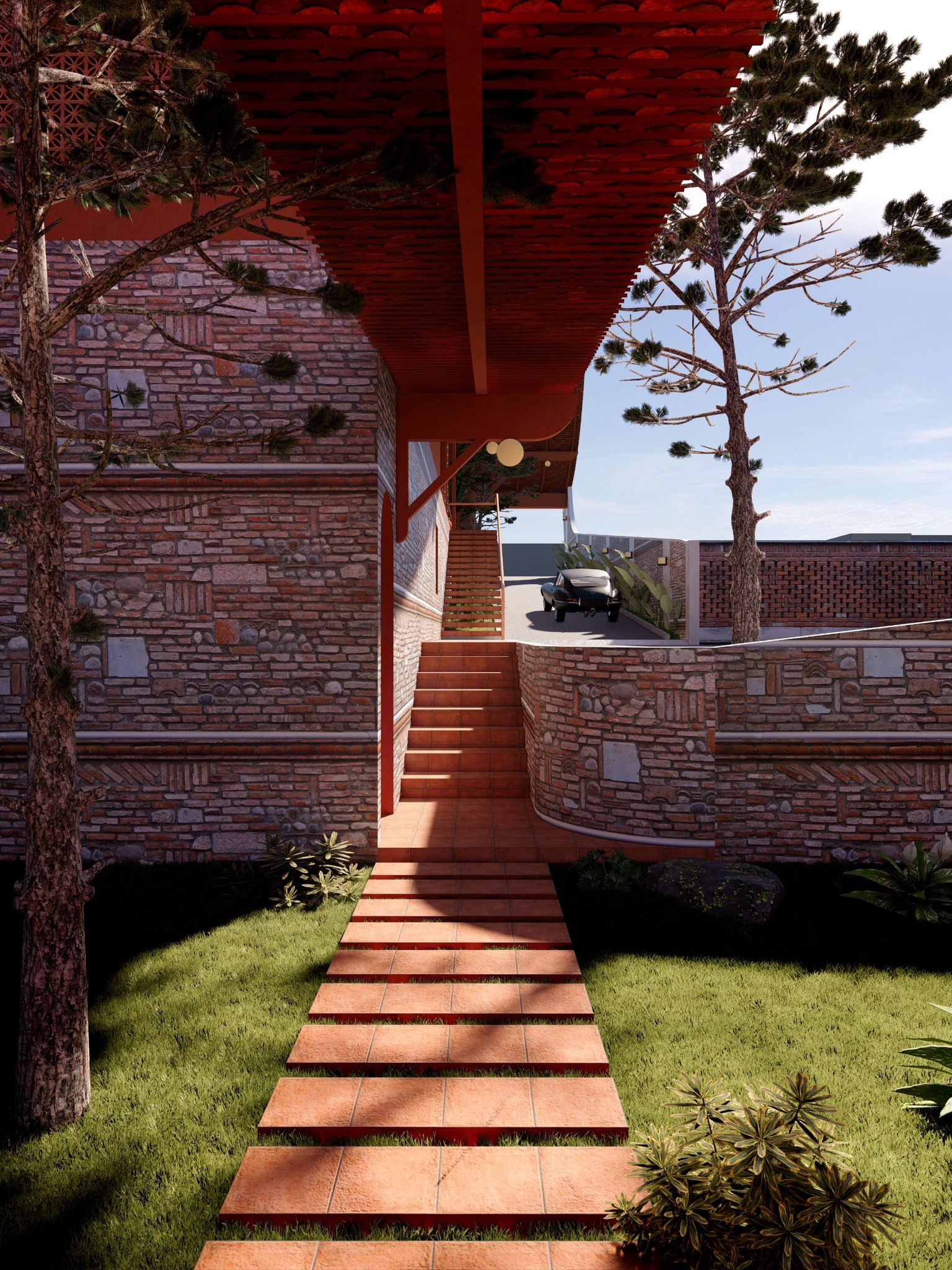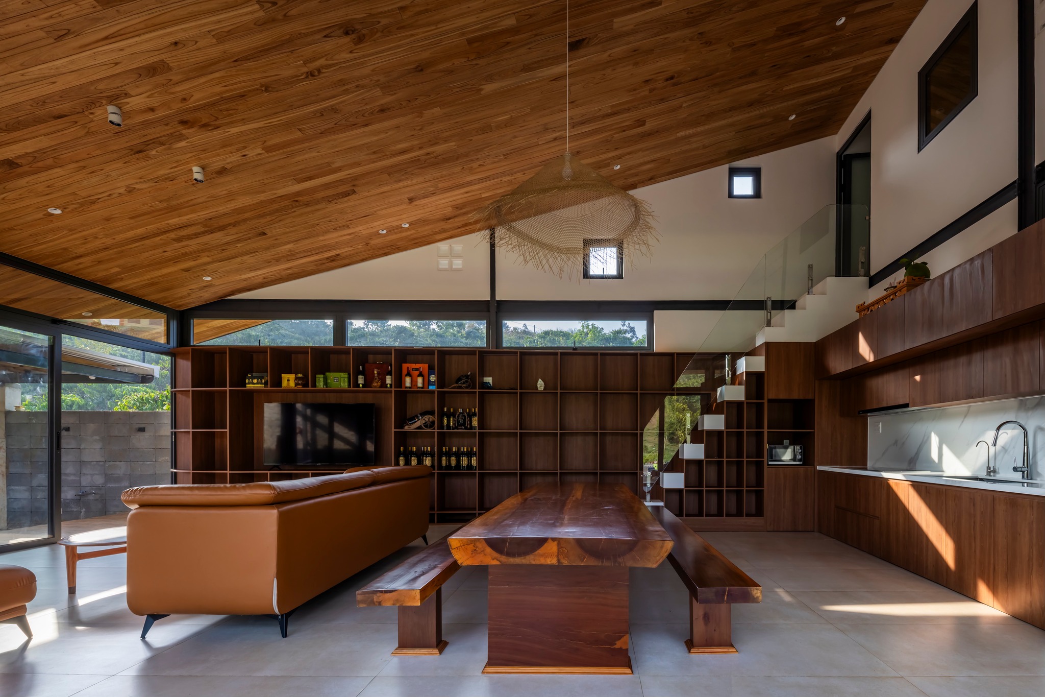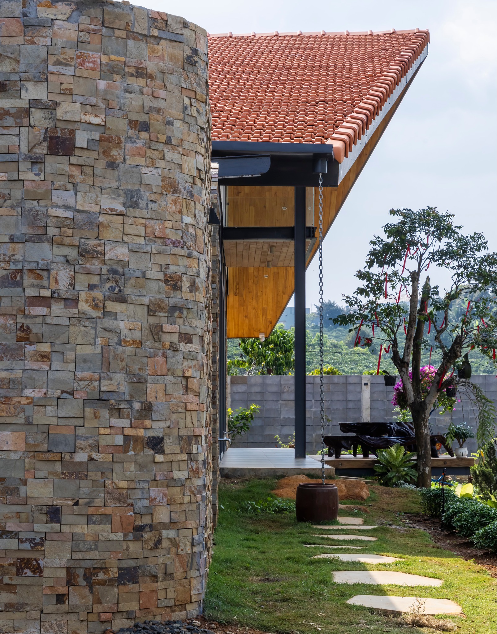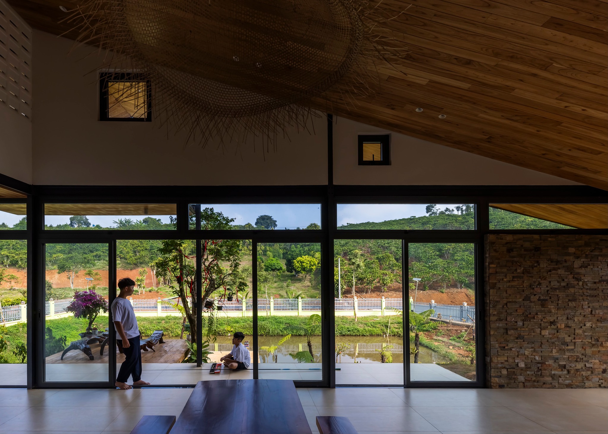 Bám theo những hình ảnh đó, Ngôi nhà với công năng đơn giản cho một gia đình nhỏ bao gồm : nơi để nghỉ ngơi, nấu ăn, tiếp khách, học tập và làm việc đã được gói gọn lại, phần lớn khu đất được dành để trồng cây, trồng rau quanh nhà và trồng hoa quanh một cái hồ lớn phục vụ sở thích nuôi cá. Ngôi nhà với một hệ mái ngói tựa như một ngọn đồi nhỏ không chen lấn mà hoà vào những ngọn đồi xung quanh, hệ trần và sàn được làm bằng gỗ tự nhiên mang lại cảm giác ấm cúng, thân thuộc.
